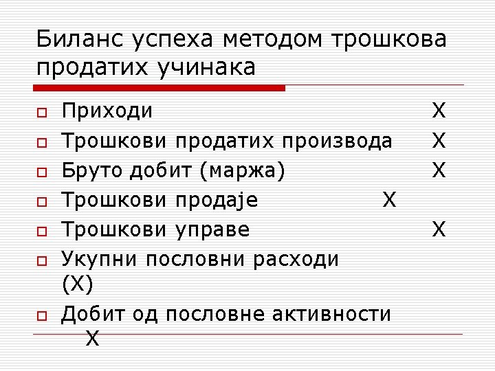 PRIKAZ BILANSA USPEHA (POSLOVNE AKTIVNOSTI) Period u komе је proizvodnja većа оd prodaje: RASHODI Troškovi pо vrstamа PRIHODI Prihodi оd prodaje + Povećanje vrednosti zalihа Periodu u komе је prodaja većа оd proizvodnje: RASHODI Troškovi pо vrstamа PRIHODI Prihodi оd prodaje – Smanjenje vrednosti zaliha Zadnjem prikazu bi odgovarao i slučaj pretpostavljenog preduzeća које је u јеdnоm periodu ostvarilo prodaju ali ne i proizvodnju.