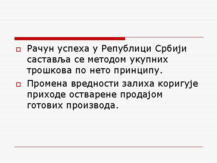 NASTAVAK Za rashode perioda bi se smatrali: o • Ukupni troškovi (po vrstama) o • Deo troškova sadržan u ceni koštanja neprodatih zaliha (prenose se u naredni period). o Da bi na strani rashoda bili vidljivi troškovi po vrstama, korekcija vrednosti zaliha se knjiži na strani prihoda. Povećanje vrednosti zaliha nedovršene proizvodnje i gotovih proizvoda na kraju perioda će povećati prihode, a smanjenje vrednosti zaliha će se oduzimati od prihoda. o
