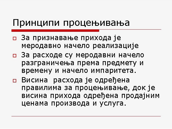 nastavak o Prihodi ulaze u obračun rezultata određenog perioda na osnovu principa realizacije, prema kome se pozitivni i negativni periodični rezultati smatraju ostvarenim tek nakon što su kupoprodajom potvrđeni na tržištu (tek nakon što su realizovani). o Primena ovog principa omogućava utvrdivanje veličine prihoda određenog obračunskog perioda, kao i trenutka kada je prihod prihvaćen na tržištu. o Sa druge strane, primena ovog principa zahteva da se sredstva preduzeća vrednuju u aktivi u visini stvarnih troškova (nabavne vrednosti ili cene koštanja) sve do trenutka njihove prodaje.