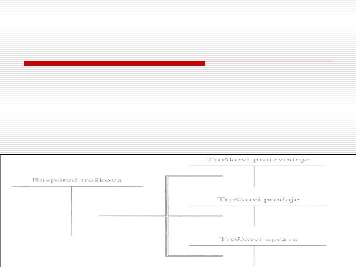 NASTAVAK o Ukoliko je na kraju godine stanje zaliha nedovršene proizvodnje i gotovih proizvoda manje nego na početku godine (Q>Q'), to će značiti da je preduzeće prodalo sve gotove proizvode proizvedene u tekućem periodu, kao i deo zaliha iz prethodnog perioda. Tada će rashode perioda predstavljati: • Ukupni troškovi (po vrstama) + • Deo troškova sadržan u ceni koštanja prodatih zaliha iz prethodnog perioda.