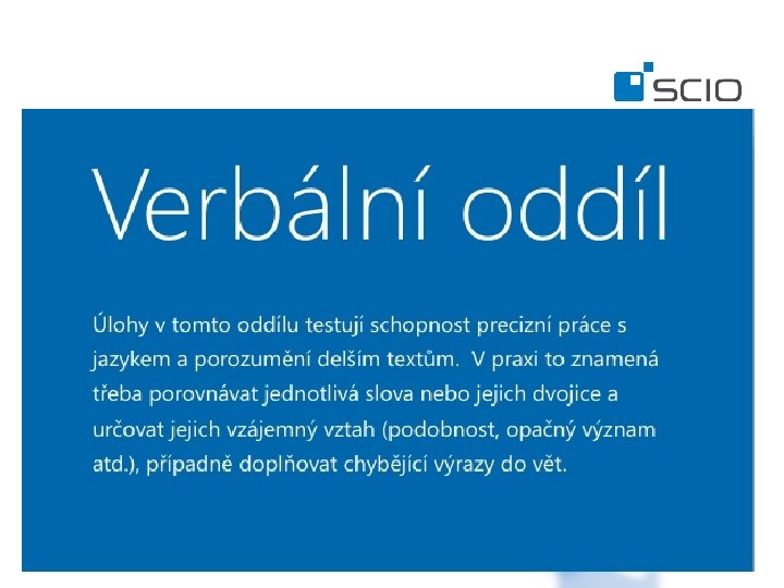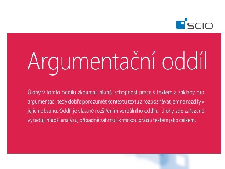 Štruktúra testu VŠP (Scio) Verbálny oddiel (25 minút, 23 úloh) Logický oddiel (30 minút, 22 úloh) Argumentačný oddiel (30 minút, 22 úloh) Kvantitatívny oddiel (25 minút, 23 úloh) CELKOM: 90 úloh / 110 minút