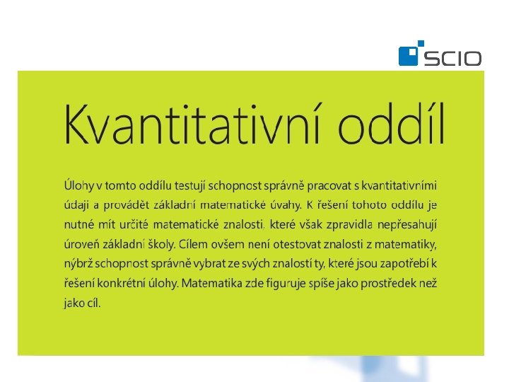 Skúšky v rámci NPS • • Obecné studijní předpoklady (OSP) Všeobecné študijné predpoklady (VŠP) Základy spoločenských vied (ZSV) Matematika AJ, NJ Prírodné vedy (Biológia, Chémia) Ekonómia (pre nadväzujúce Mgr. štúdium) Ukážkové testy zdarma na www. scio. sk/nps/popis-a-ukazky. asp