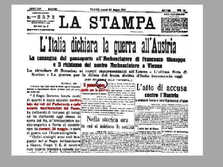 • PATTO DI LONDRA: Salandra (capo del governo) e Sonnino (ministro degli esteri) allacciarono rapporti segreti con le forze dell’Intesa ed infine decisero, con il solo avvallo del re, di accettarne le proposte e di firmare il 26 Aprile 1915 il patto di Londra con Francia, Inghilterra e Russia. • L’Italia, in caso di vittoria avrebbe ottenuto: il Trentino, il Sud Tirolo (Alto Adige), la Venezia Giulia, l’intera penisola istriana (eccetto Fiume) ed una parte della Dalmazia. Nella concezione diplomatica di Sonnino, il Patto di Londra non prevedeva la disgregazione dell’impero asburgico, ma solo un suo ridimensionamento a vantaggio dell’Italia nell’Adriatico. • La volontà neutralista manifestata dal Parlamento italiano fu scavalcata dal re che rifiutò le dimissioni di Salandra. • Radiose giornate di Maggio: appoggio della popolazione, mobilitata dagli interventisti. Roma divenne teatro di manifestazioni contro Giolitti e contro i parlamentari, accusati di essere traditori della Patria. L’ITALIA ENTRA IN GUERRA D’Annunzio in questa occasione si propose come poeta vate di una nuova Italia in guerra. Il 23 Maggio il Governo italiano dichiarò guerra all’Austria