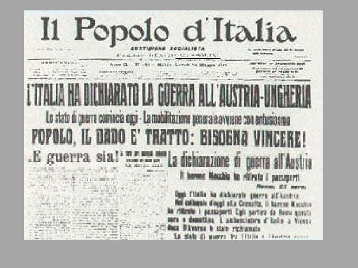 • PATTO DI LONDRA: Salandra (capo del governo) e Sonnino (ministro degli esteri) allacciarono rapporti segreti con le forze dell’Intesa ed infine decisero, con il solo avvallo del re, di accettarne le proposte e di firmare il 26 Aprile 1915 il patto di Londra con Francia, Inghilterra e Russia. • L’Italia, in caso di vittoria avrebbe ottenuto: il Trentino, il Sud Tirolo (Alto Adige), la Venezia Giulia, l’intera penisola istriana (eccetto Fiume) ed una parte della Dalmazia. Nella concezione diplomatica di Sonnino, il Patto di Londra non prevedeva la disgregazione dell’impero asburgico, ma solo un suo ridimensionamento a vantaggio dell’Italia nell’Adriatico. • La volontà neutralista manifestata dal Parlamento italiano fu scavalcata dal re che rifiutò le dimissioni di Salandra. • Radiose giornate di Maggio: appoggio della popolazione, mobilitata dagli interventisti. Roma divenne teatro di manifestazioni contro Giolitti e contro i parlamentari, accusati di essere traditori della Patria. L’ITALIA ENTRA IN GUERRA D’Annunzio in questa occasione si propose come poeta vate di una nuova Italia in guerra. Il 23 Maggio il Governo italiano dichiarò guerra all’Austria