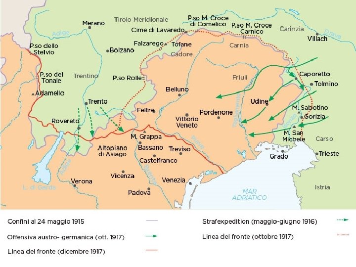1915 – 1916: LA GRANDE STRAGE • Le forze austro-ungariche si dispongono sulle posizioni difensive più favorevoli: lungo il fiume Isonzo e sulle alture del Carso; il fronte italiano si estendeva per circa 600 chilometri, dal Passo dello Stelvio al fiume Isonzo, e dalle Alpi carniche al golfo di Trieste. (E. Gentile, Storia illustrata della grande guerra, p. 85) 1915: le truppe italiane, guidate da Luigi Cadorna le affrontano in 4 battaglie sanguinose e fallimentari (66. 000 morti e 180. 000 feriti senza riportare risultati importanti) ( J. Keegan, La prima guerra mondiale, Carrocci, Roma, 2012, p. 390) • • Febbraio 1916: le truppe tedesche attaccano i Francesi a Verdun; fu una carneficina per entrambi gli schieramenti (oltre 600. 000 morti, tra tedeschi e francesi, in quattro mesi) • Sulla Somme (pochi mesi dopo): controffensiva degli inglesi con introduzione dei tanks (carri armati) In 6 mesi quasi 1 milione di morti • Dal 14 Maggio al 2 Giugno 1916: Strafexpedition (spedizione punitiva contro l’ex alleato traditore); gli italiani riescono faticosamente ad arrestarla sugli altipiani di Asiago (E. Gentile, op. cit. , p. 89 -90) • • Dimissioni governo Salandra, sostituito da Paolo Boselli Altre 5 battaglie sull’Isonzo e presa di Gorizia (agosto 1916).