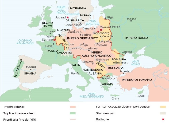 LA GUERRA DIVENTA MONDIALE STATI CHE SI AFFIANCANO ALLA TRIPLICE INTESA • Agosto 1914: il Giappone dichiara guerra alla Germania (per impadronirsi dei possedimenti tedeschi nel Pacifico) • 23 Maggio 1915: l’Italia entra in guerra contro l’Austria. Ungheria • Portogallo • Romania • Grecia • Aprile 1917: gli Stati Uniti • Cina, Brasile ed altre Repubbliche latino-americane STATI CHE AFFIACANO LA TRIPLICE ALLEANZA • Novembre 1914: la Turchia interviene a favore degli Imperi centrali • Bulgaria