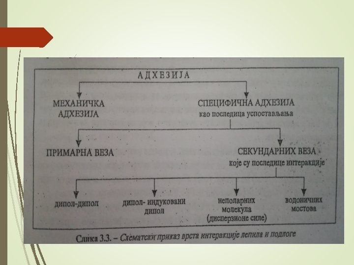 Kako nastaje specifična adhezija? Uspostavljanjem primarnih i sekundarnih veza izmedju LJEPILA i PODLOGE (površina predmeta koji se lijepi)