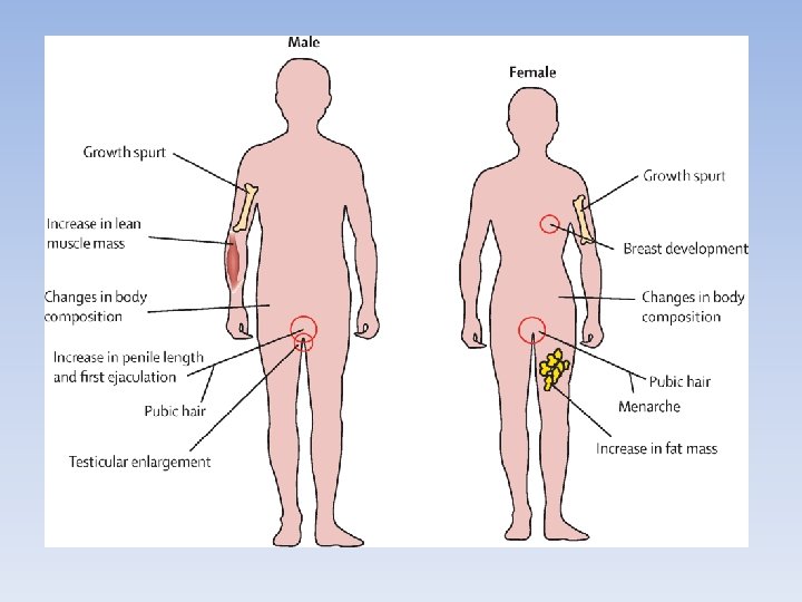 Secondary characteristics • Secondary sexual characteristics are those that emerge during the prepubescent through post pubescent phases • They are visible changes such as: - Growth of hair - Change in body shapes for both males and females