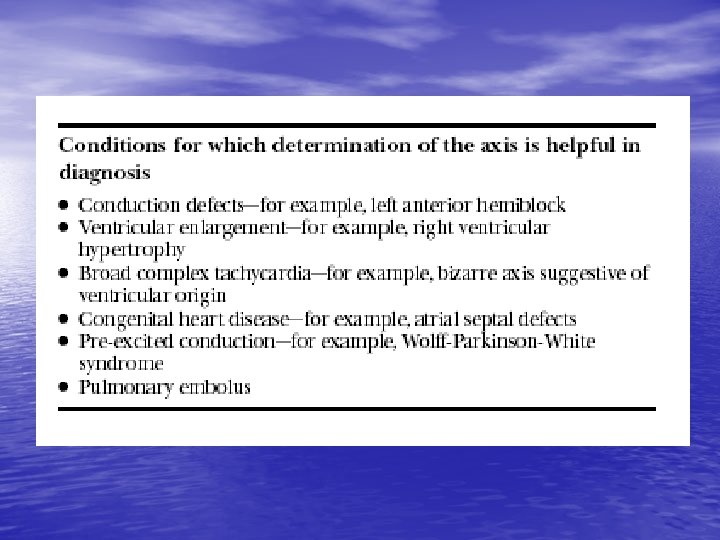 Determining the Axis • 2 simple methods – 1. Look at leads I and II: QRS vector should be positive in both. If positive in I and negative in II then LAD; if negative in I RAD – 2. Look for isopotential vector in limb leads: ie QRS with equal positive and negative deflections. The axis is 90 deg to this.