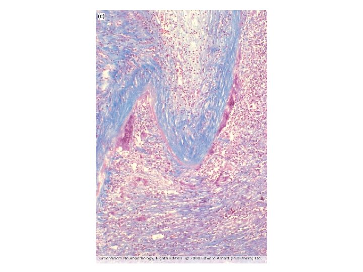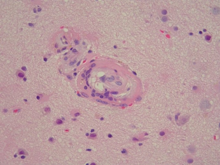 Vasculitis in systemic diseases • Lupus – 50 -75% of patients have CNS involvement – Immune complex mediated vasculitis may lead to infarcts, vessels show fibrinoid necrosis, mononuclear inflammation and fibrosis – However, a predisposition to thrombosis is also advanced as the main cause of the CNS damage, and some authors discount vasculitis entirely • Polyarteritis nodosa – Causes necrotizing lesions in medium sized to small arteries – In systemic PAN the visceral organs are targeted – In limited PAN both skeletal muscle and peripheral nerve are involved with late CNS involvement