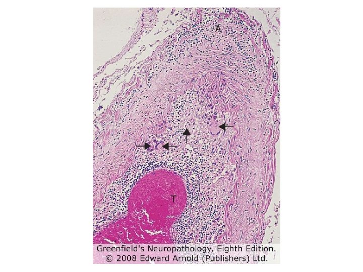 Infectious causes • Bacterial – Both small and large arteries can be involved in pneumococcal meningitis and tuberculous meningitis, resulting in large infarcts • Spirochetes – Heubner’s arteritis occurs in meningovascular neurosyphilus; typically involves large extracranial arteries; T. pallidum cannot usually be identified in the vessel wall – Lyme disease due to B. burgdorferi which binds to vessel walls and induces vasculitis.