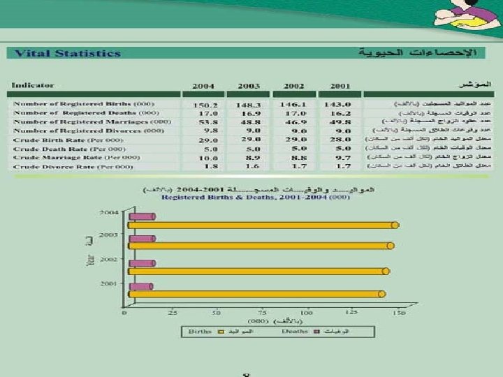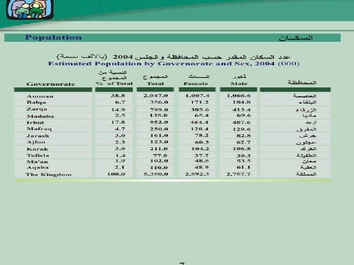 Challenges • While low infant mortality rates and high life expectancy - are among the best in the region, the population growth rate continues to be a major development constraint - especially when analyzed in light of the quantity and quality of services to be provided to accommodate this rapid increase in population. • The landmark passage of the National Population Strategy (NPS) in March 1996 and the passage of the Reproductive Health Action Plan, a sub-strategy of the NPS, in April 2004 make it clear that Jordan is serious about family planning. • Less than fully functional public health systems, • An unmet demand for high quality maternal - child health care services and information, • A significant increase in the prevalence of chronic diseases.