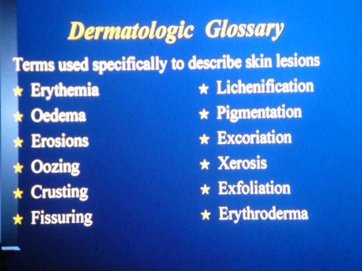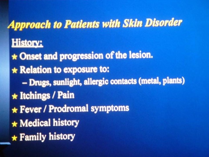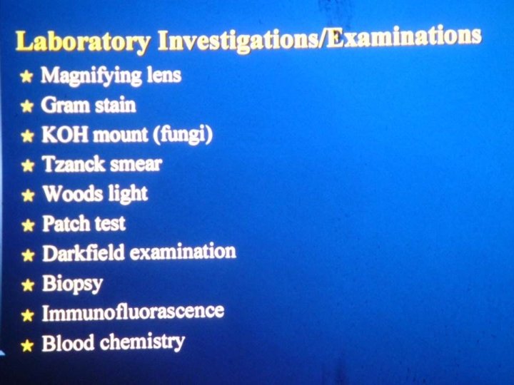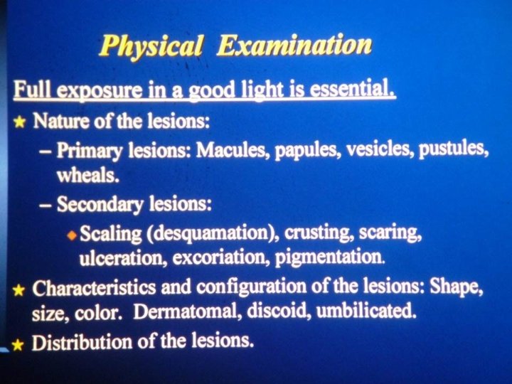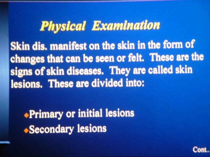 • Primary lesions are de-novo lesions while secondary are either a sequence of the natural history of the disease or a modification of the primary lesion which can be either due to drug use or iatrogenic by itching. • Dermatological test of choice is skin biopsy and it is done whenever we are in doubt.