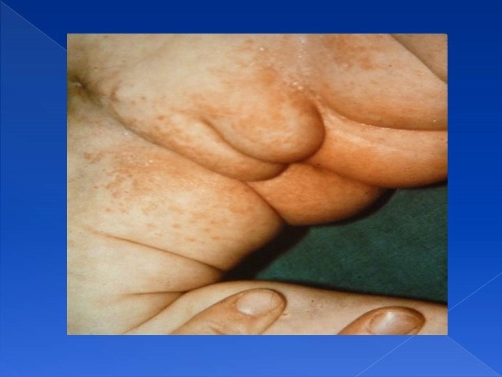 Erythema Toxicum Neonatorum 1. 2. 3. 4. 5. 6. 7. 8. It is a macular generalized patchy red rash. Benign and self limiting. Ruptures and resolves spontaneously. Therefore reassure the patient. Patient does not look sick and has no fever. Macules are the commonest presentation, but can also present with papules and vesicles. It is an esinophilic eruptions. Scraping taken from the lesion will show esinophils aggregate. The next picture also shows infantile gynaecomastia, which is physiological due to the maternal hormones. It can also produce milk. It resolves spontaneously when the estrogen levels go down in the blood. Do not squeeze it or touch it because you might induce mastitis.