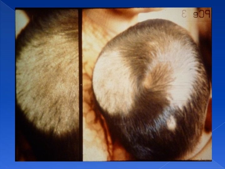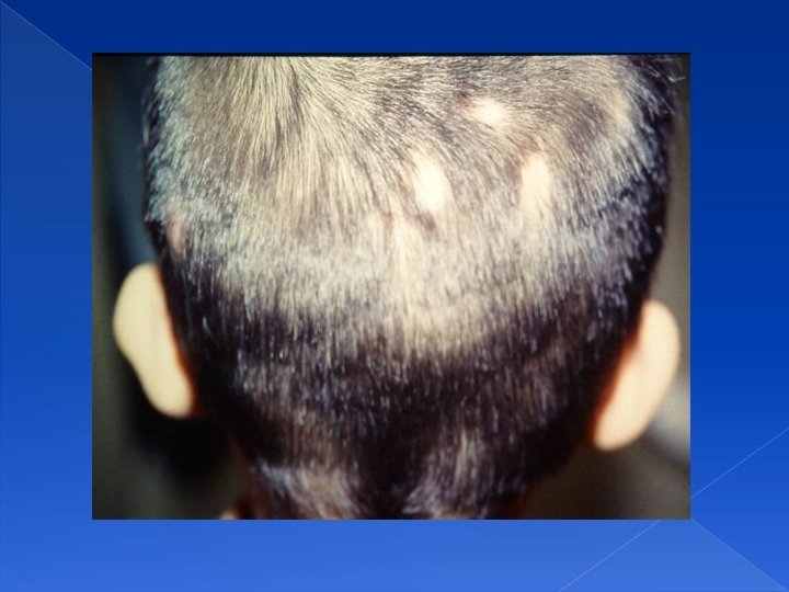 Alopecia • Alopecia areata is an autoimmune diseas, should be investigated for other autoimmune endocrinopathies. The lesion is clean. • Tinea capitis: dirty lesion that might ulcerate and ooze and has a bad smell. • It is treated by steroids and antifungal, steroid, and sometimes antibiotics.