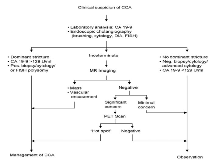 Diagnosis 1. Biliary stricture with positive endoscopic biopsy or cytology, or 2. Dominant hilar stricture plus one or more of the following: i) A hilar mass lesion, ii) CA 19 -9 >100 in the absence of cholangitis, iii) Polysomy by FISH
