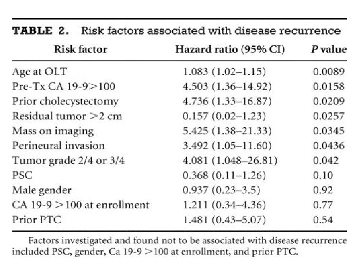 Multivariate Analysis of Predictors of Tumor Recurrence–Free Survival Hong JC. Arch Surg 2011; 146: 683 -689 Variable HR Surgical therapy RR (vs OLT) 4. 3 Tumor location Hilar (vs intrahepatic) 3. 2 Tumor histology and extension Perineural invasion 5. 1 Multifocal 4. 7 Tumor size >3 (hilar) and > 5 cm (intrahepatic) 2. 0 P Value. 003. 001 . 09