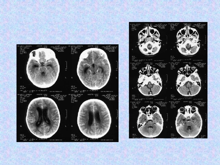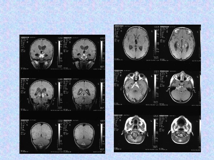 Esetismertetés K. J. • 1997. 04. született lány , 3. gyermek, normális perinatális fejlődés, terhelő szülői és autoanamnézis nélkül. • 1998. márciusában hyperpyrexiával, hányingerrel, hányással járó állapot miatt kezelték, dg. : napszúrás. • 1998. május elején fejfájás, gyakori hányás miatt indult kivizsgálása. • Az elkészült CT vizsgálat hydrocephalust igazolt, ICF jelei mellett.