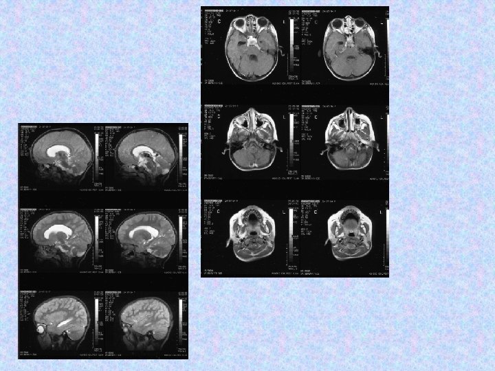• 1998. június 30 -án jobb oldali VP shunt került behelyezésre. Biopsziát későbbre terveztek. • 1998. július 20 -án készült CT beszűkült szupratentoriális kamrarendszert mutat. A shunt jó pozícióban helyezkedik el. • Az 1998. augusztusi MRI nem mutat progressziót sem a kraniális, sem a spinális folyamatokban. • Az 1998. december 7 -i MR felvétel progressziót mutat. Neurológiailag a betegnek kétoldali Babinski tünetei, élénk mélyízületi reflexei vannak, izomzata hypotoniás. Egyebekben negatív státusz. A shunt közepes nyomás mellett jól vezet.