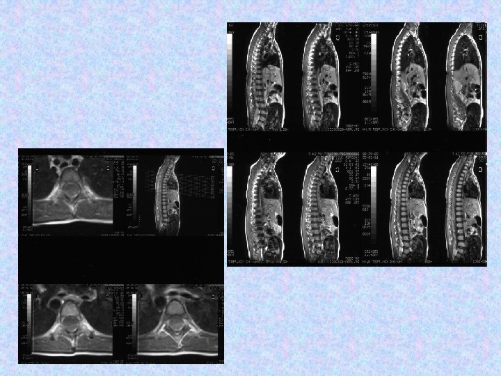 • MR vizsgálat készült liquorpassage zavar miatt. • MR vizsgálat meningeális kontraszthalmozást mutatott a bazális ciszterna, a cerebri media, a ciszterna magna területében. • Felmerült a meningitis basilaris gyanúja, amely nem igazolódott. • Liquor fehérje: 7, 05 g/l, glükóz: 5, 0 mmol/l, sejtszám 10/látótér. Baktérium nem tenyészett ki. Mikrobiológia, szerológia negatív. Citológia gyulladásos szedimentációt véleményezett. Tumor sejtek nem voltak láthatóak. • Spinalis MR thoracalis compressziót, meningeális szóródást mutatott.