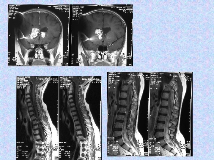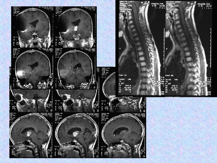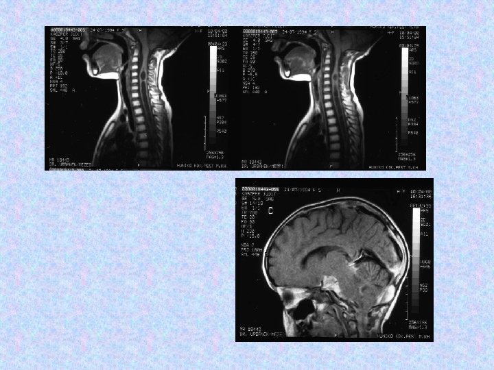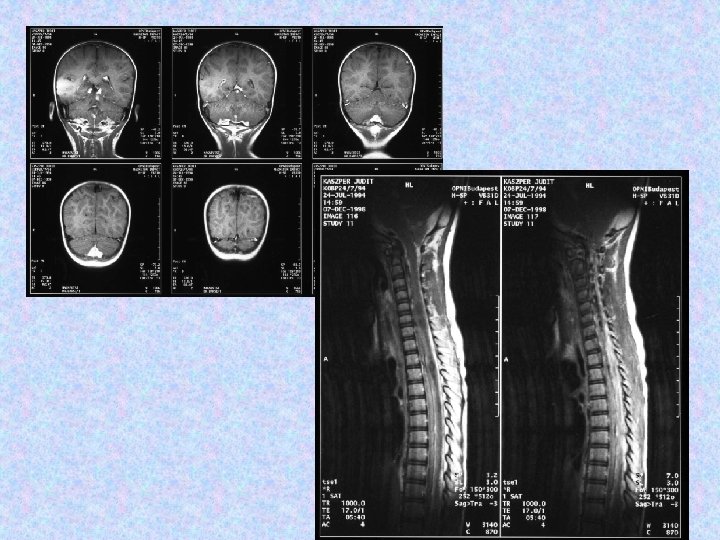 • 2002. július 10 -én koponya és teljes gerinc MRI felvétel történt. A koponya MRI felvételek összevetve a 2001. június 27 -i felvételekkel aszimmetrikus kamrarendszert mutattak, a bal kamra kitágulásával. A jobb kamra szűk, a shunt vége a frontális szarv dorzális részében helyezkedik el, jól működik. A harmadik kamra területén egy intenzíven halmozó terime látható, továbbá bal kamraszarvban bazálisan. A szubarachnoideális liquorterek megtartottak, kóros halmozás nem figyelhető meg. • A gerinc MR felvételen a kraniocervikális átmenetben, a nyúltvelő ventrális felszínén sáv alakú halmozást írtak le. Th. VII-VIII. , L. I-II. csigolyákban, a conus körül szolid halmozás figyelhető meg. Az alacsonyabb thoracalis szakaszokon lévő myelon felszínén és intradurálisan homogén halmozást írtak le. • A neuro-onkológiai konzílium nem javasolt további kemo- és radioterápiát.