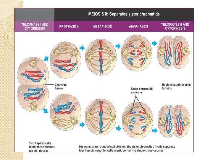 MEIOSIS II PROFASE Durante la segunda división meiotica no se produce la replicación del ADN. Los cromosomas se condensan METAFASE Cromosomas se alinean al ecuador. Replicación de centromeros ANAFASE Y TELOFASE Cada cromosoma se divide en dos de cadena única CITOCINESIS La célula se divide