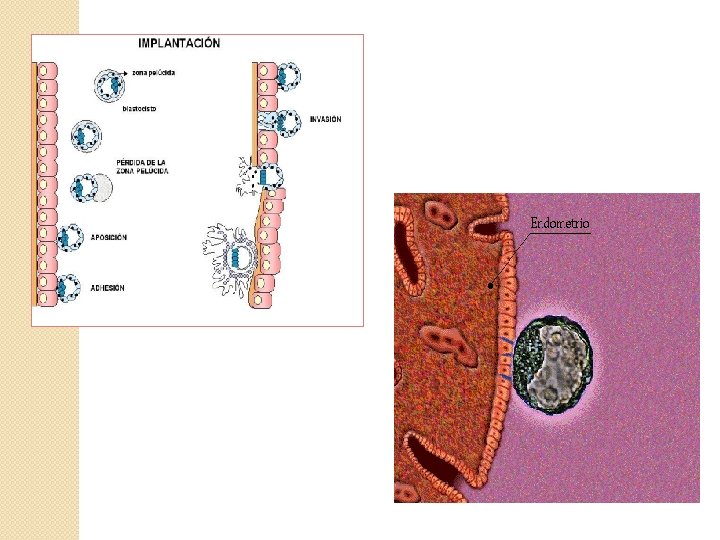 El blastocito se implanta generalmente en la porción posterior del fondo. IMPLANTACION Las glándulas endometriales se agrandan. Se orienta con la masa celular interna Es dirigida al endometrio 7 días después el blastocito se fija el endometrio