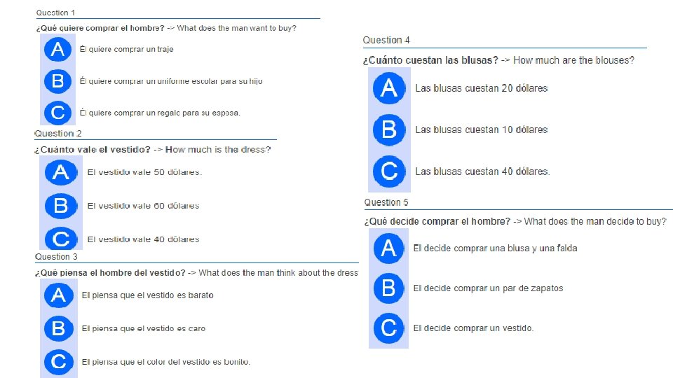 Vendedora: Disculpe ¿Puedo ayudarle en algo? Comprador: Si, estoy buscando un regalo para mi esposa, algo que ella pueda usar… Vendedora: Tenemos vestidos muy bonitos como este… Comprador: Ya veo. ¿Cuánto vale este vestido? Vendedora: Este vestido vale 50 dólares. Comprador: aja… Creo que es un poco caro y no me gusta mucho el color. ¿Cuánto cuestan estas blusas y esas faldas? Vendedora: Las blusas cuestan 20 dólares y las faldas 25. Comprador: La blusa y la falda me gustan más, y creo que combinan con sus zapatos. Vendedora: Entonces a ella le va a encantar. También vendemos ropa para caballeros como trajes, camisas, camisetas y corbatas. After listening to Comprador: Gracias, pero creo que solo llevaré estas the conversation, dos cosas answer the question Preimera Actividad* Extendida Link
