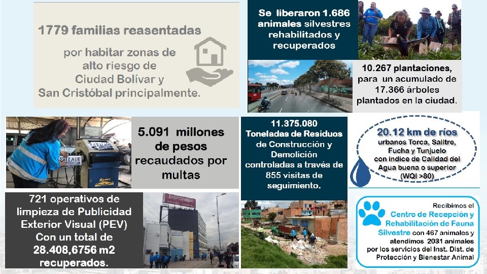 METAS SECTOR AMBIENTE Programa 39. Ambiente sano para la equidad y disfrute del ciudadano. Metas Resultado Metas Producto Meta Indicador Intervenir 27 hectáreas de suelo degradado y/o contaminado Número de hectáreas de suelo degradado y/o contaminado intervenidas Priorizar e implementar 16 proyectos del plan de acción de la Política de Bienestar Animal % Avance Meta Indicador Avance % Avance 13, 37 49, 52% Identificar áreas (has) / predios con suelo degradado y/o contaminado Trámite de las solicitudes concepto de diagnóstico ambiental relacionadas con el cambio de uso de suelo o con sospecha de contaminación de los predios del área urbana 37, 5% Número de proyectos priorizados e implementados del plan de acción de la Política de Bienestar Animal 5 31, 25% Consolidar un Instituto de protección y bienestar animal Un instituto de protección y bienestar animal consolidado. 1 100% Poner en marcha el nuevo Centro Recepción y Rehabilitación de Fauna y Flora Silvestre contemplándose la implantación de soluciones provisionales alternas durante la fase constructiva para garantizar la continuidad en las acciones de control de los dos recursos. Nuevo Centro Recepción y Rehabilitación de Fauna y Flora Silvestre en operación. 0, 09 9% Construir un nuevo Centro Recepción y Rehabilitación de Fauna y Flora Silvestre Nuevo Centro Recepción y Rehabilitación de Fauna y Flora Silvestre construido 0, 09 9% Ejecutar 45. 000 actuaciones técnico jurídicas de evaluación, control, seguimiento, prevención e investigación para conservar, proteger y disminuir el tráfico ilegal de la flora y de la fauna silvestre. Número de actuaciones técnico jurídicas de evaluación, control, seguimiento, prevención e investigación. 16, 685 37, 08% Aumentar en un 10% las actuaciones de control al tráfico ilegal de flora y fauna silvestre, que incluyen tenencia, movilización, transformación, comercialización y/o aprovechamiento provenientes de todo el país. Porcentaje de actuaciones de control al tráfico ilegal de flora y fauna silvestre Sin Reporte Sin reporte Poner en marcha un Centro de Protección y Bienestar Animal -Casa Ecológica de los Animales- Un Centro de Protección y Bienestar Animal -Casa Ecológica de los Animales funcionando 0, 35 35% Construir un Centro de Protección y Bienestar Animal Casa ecológica de los animales Una casa ecológica de los animales construida 0, 35 35% Formular, adoptar y ejecutar el Plan Distrital de Silvicultura Urbana, Zonas verdes y Jardinería con prospectiva de ejecución a 12 años, definido en el Decreto 531 de 2010 y adelantar su implementación en un 30% Un Plan Distrital de Silvicultura Urbana, Zonas verdes y Jardinería formulado, adoptado y en ejecución 0, 08 8% Plantar 86. 000 los árboles y arbustos en el espacio Público urbano Número de árboles plantados 17366 20% Incrementar las zonas verdes de jardinería en 18. 000 metros cuadrados nuevos Número de metros cuadrados nuevos en zonas verdes de jardinería 20680 86% 2. 500. 000 de ciudadanos participan en procesos de cultura y educación ambiental. Número de ciudadanos vinculados 1219162 48, 77% Aumentar en valor real de la cobertura verde en el espacio público urbano de Bogotá D. C. (arbolado 7%, zonas verdes en 0, 2% y jardinería en 20%) garantizando el mantenimiento de lo generado y lo existente. Porcentaje de cobertura de jardinería incrementada Avance 63 63, 16%