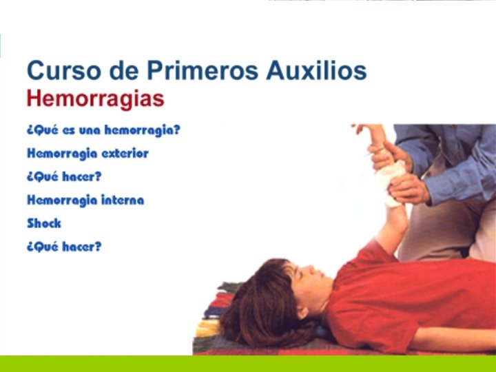 hemorragias ¿qué hacer? • Chequear el A, B, C • Recostar a la víctima boca arriba • Elevar las piernas de la víctima 30 a 40 centímetros (colocando una manta) • Prevenir la pérdida de calor abrigando a la víctima • Buscar atención médica