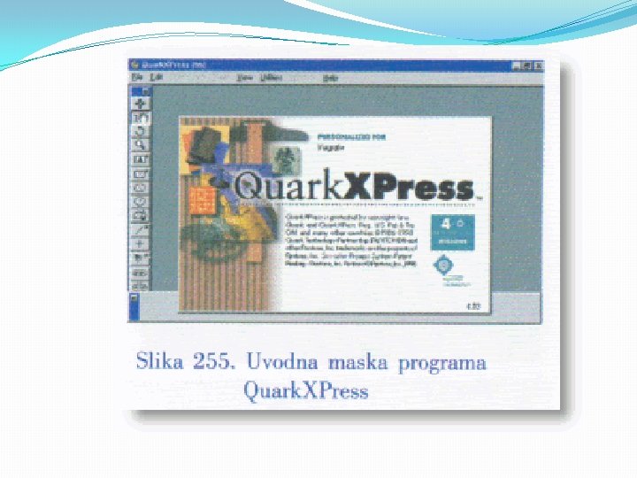 SOFTVER ZA PRIPREMU MATERIJALA ZA ŠTAMPU Quark. Xpress je program koji preko svojih projekata omogućava profesionalnu pripremu različitih publikacija za štampu (časopisi, knjige, prezentacije i dr. ). Pomoću brojnih alatki program omogućava: kreiranje tekst boksova, bojenje pozadine, poravnanje teksta, uklapanje teksta, dodavanje kolona teksta, dodavanje naslova, dodavanje boksa za slike, korištenje gotovih šablona, dodavanje zaglavlja, numerisanje stranica, definisanje stilova, rad sa slikama i dr.