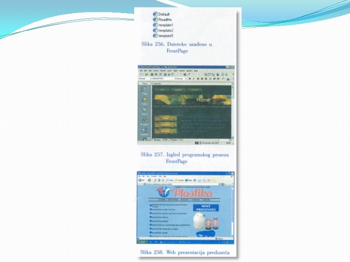 WEB PREZENTACIJE �Front Page- omogućava korisnicima kreiranje i održavanje Web stranica na mreži. U Web stranice moguće je uključiti multimedijalne sadržaje. Programski editor nudi na jednom mjestu sve neophodne alatke za izradu Web sajta. Upotrebom programa "čarobnjaka" moguće je na brz i efikasan način uraditi Web prezentaciju. Web prezentacije se mogu kreirati za lične ili profesionalne potrebe.
