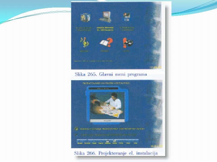 Električne instalacije je obrazovni računarski program Fakulteta tehničkih nauka iz Zrenjanjina. Glavni meni programa (slika 265) nudi interaktivno učenje električnih instalacija i osvjetljenja, projektovanje električnih instalacija, informacije o programu i autorima, dodavanje ili uklanjanje muzike, pomoć pri radu sa programom i izlaz iz programa. U donjem desnom uglu imate mogućnost da kontrolišete sopstveno vrijeme rada u ovom programu. Ukoliko se odlučite za samostalno učenje nastavnih sadržaja iz električnih instalacija i osvjetljenja onda ćete zaista biti u prilici da saznate mnoštvo odgovarajućih zanimljivih tekstualnih, audio i audio—vizuelnih informacija.