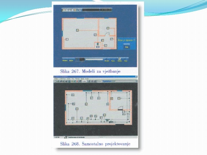 �Modeli za vježbanje projektovanja električnih instalacija, (slika 267) služe za interaktivno vježbanje u oblasti projektovanja. Nakon pravilnog unošenja gotovih elektrotehničkih simbola u tlocrt ponuđenog objekta, program automatski iscrtava električnu instalaciju objekta. Nakon završetka ove interaktivne vježbe bićete u situaciji da provjerite ispravnost vašeg rada. Samostalno projektovanje električnih instalacija predstavlja jednostavan editor za projektovanje, (slika 268).