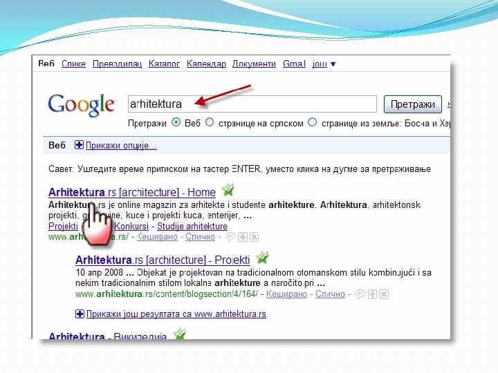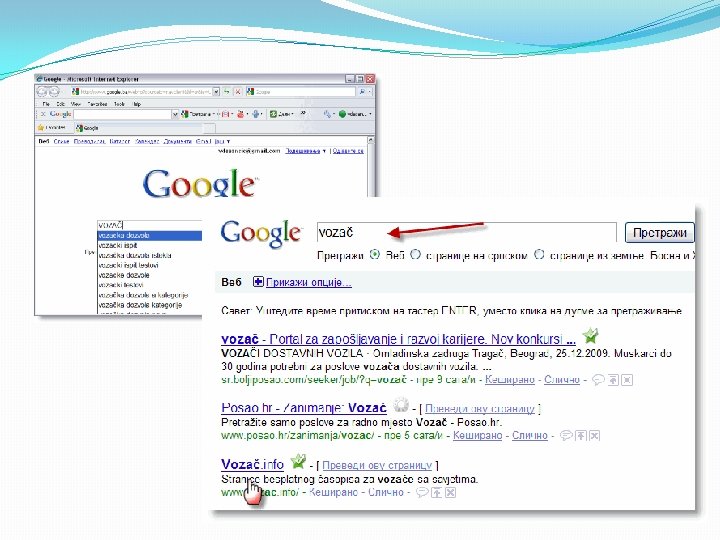 Radni zadatak: Koristeći pretraživače na Internetu pronađite informacije vezane za vaše buduće zanimanje. Koraci rada: 1. pokrenite Internet Ехрlorer (ili Netscape Communicator), 2. u adresnu liniju unesite google. com (ili yahoo. com) pa pritisnite taster Enter, 3. u polju Google Search unesite ključnu riječ (na primjer: krojač, pekar, kuvar, mehaničar, tekstil, plastika, masinstvo i dr. ) i pritisnite taster Enter, 4. nakon pretrage dobićete lokacije koje su vezane za ključnu riječ pretrage. 5. pokrenite željenu Web stranicu.