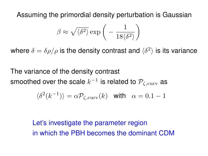 I. Introduction : Primordial black hole (PBH) Primordial BH is formed at the very early stage of the universe through the collapse of the extremely high density region primordial large density (curvature) perturbation ( Stellar BH is formed through the gravitational collapse of a star )