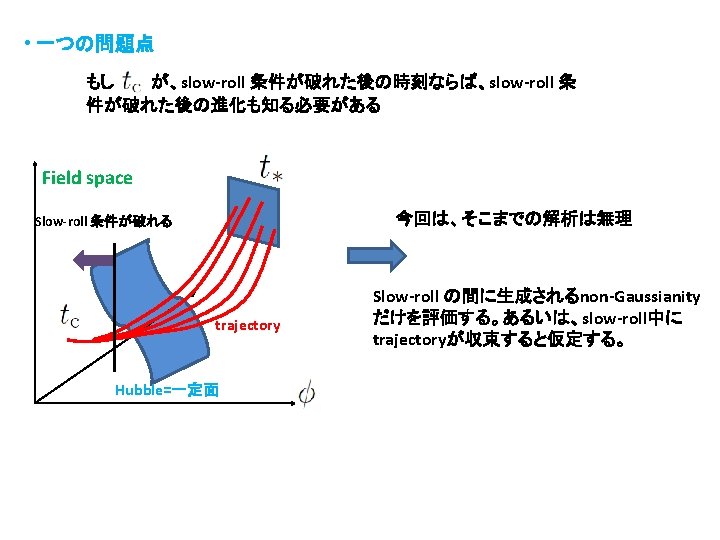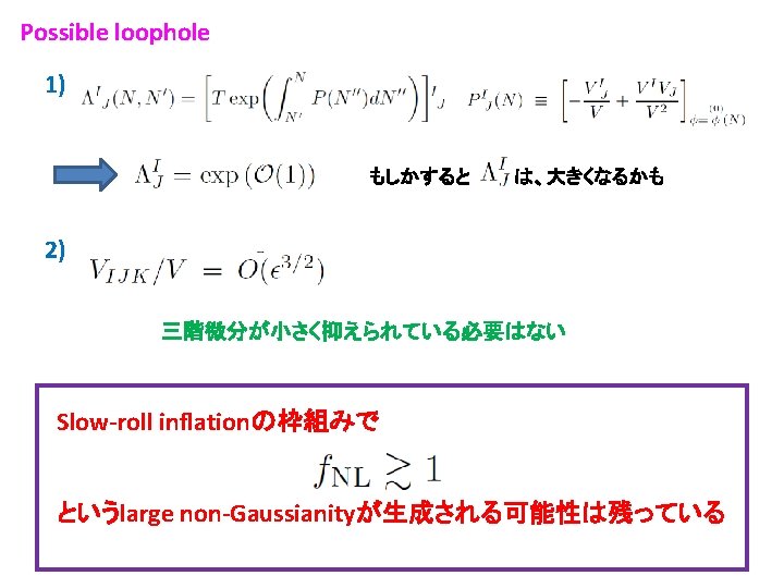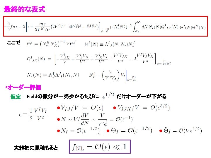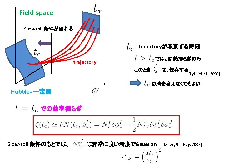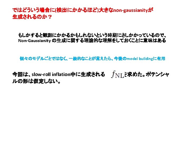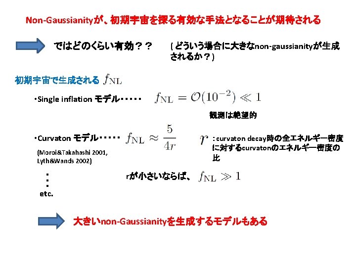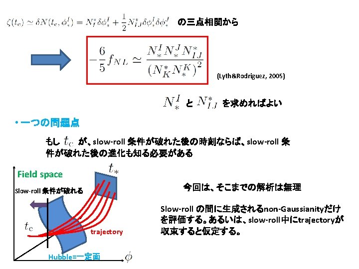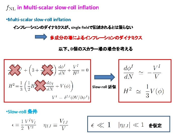 in Multi-scalar slow-roll inflation • Slow-roll 条件 を仮定 での曲率揺らぎ Slow-roll 条件のもとでは、 は非常に良い精度でGaussian (Seery&Lidsey, 2005) Leading orderでは (Lyth&Rodriguez, 2005)