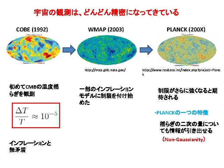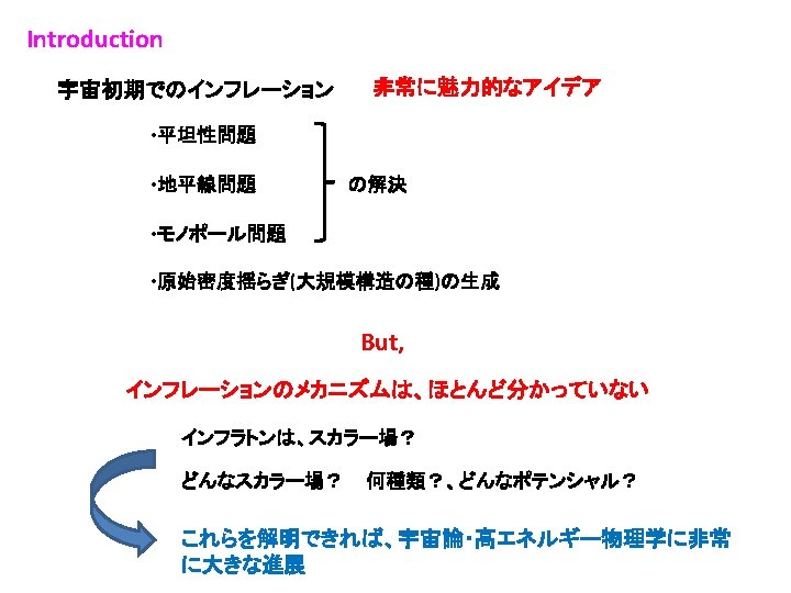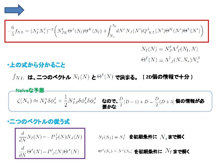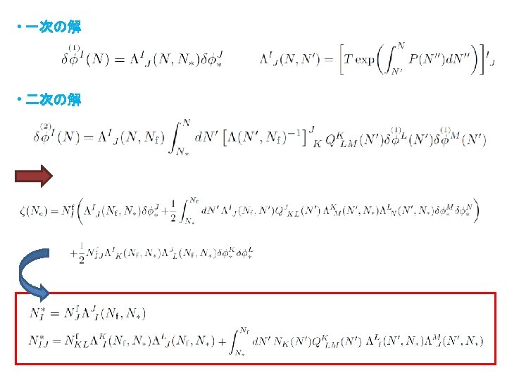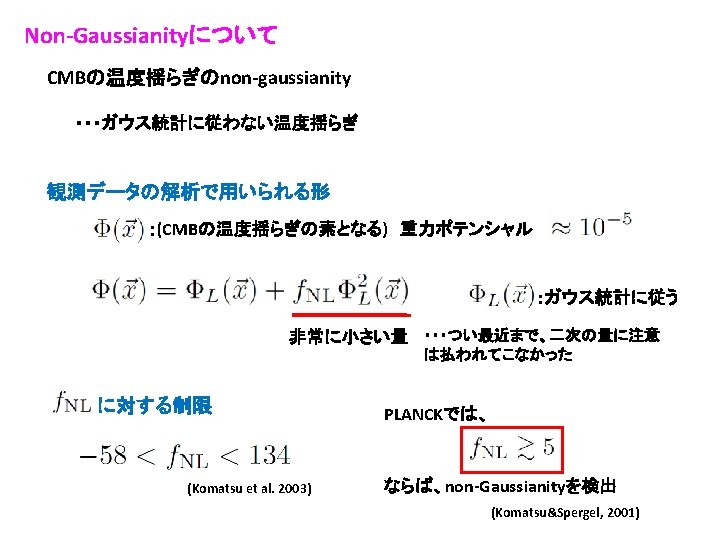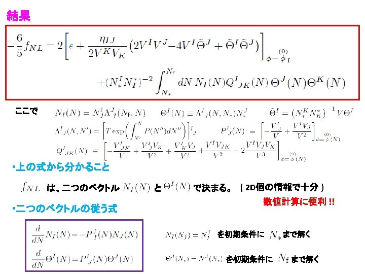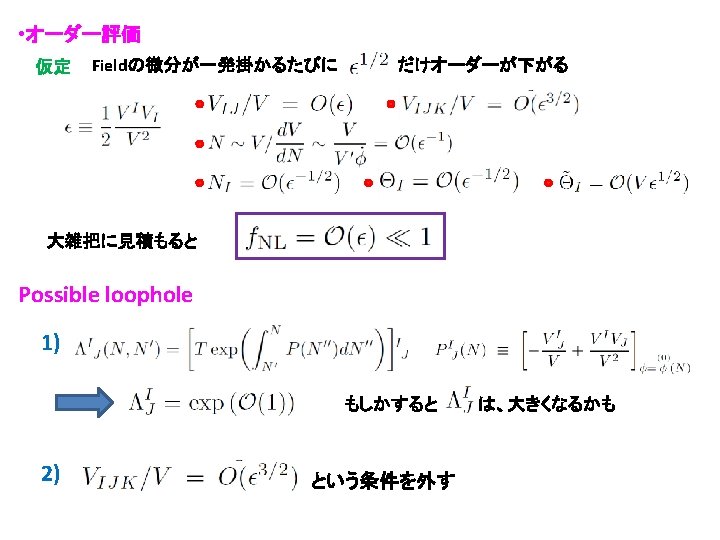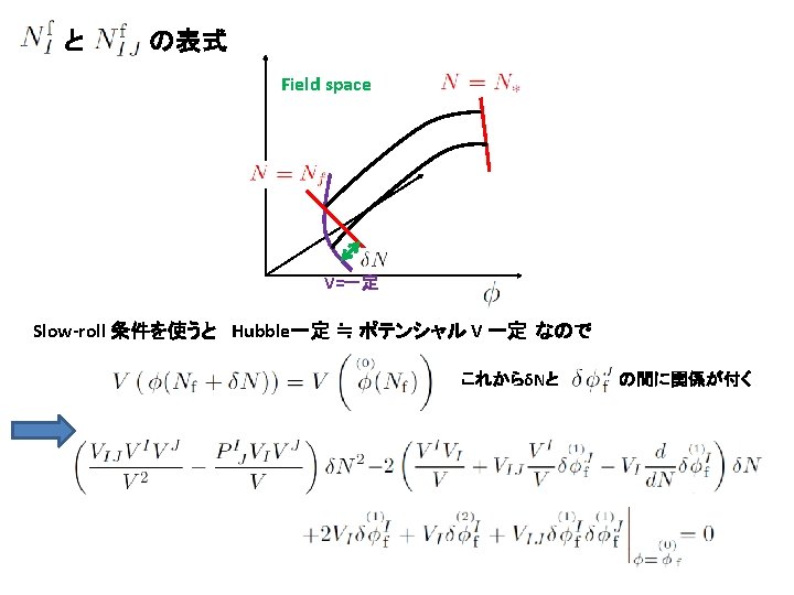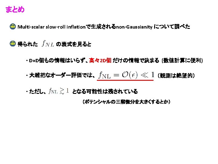 in Multi-scalar slow-roll inflation • Slow-roll 条件 を仮定 での曲率揺らぎ Slow-roll 条件のもとでは、 は非常に良い精度でGaussian (Seery&Lidsey, 2005) Leading orderでは (Lyth&Rodriguez, 2005)