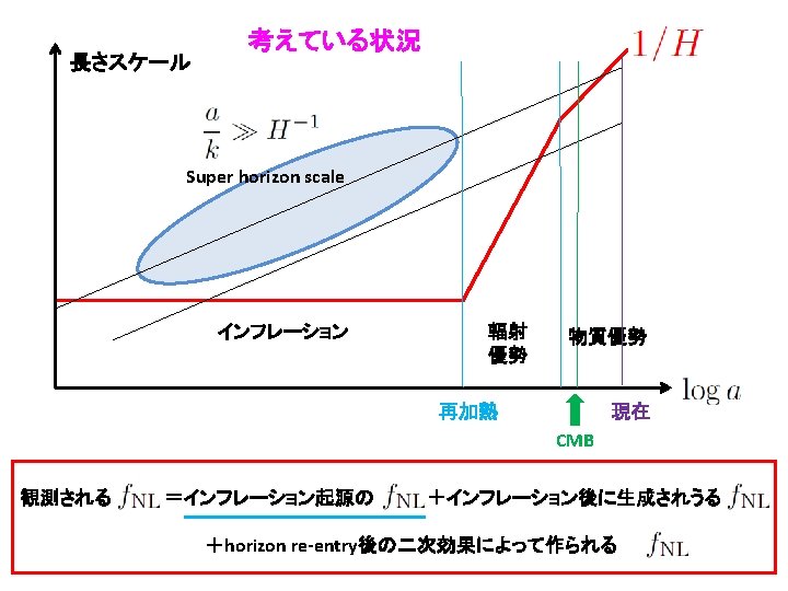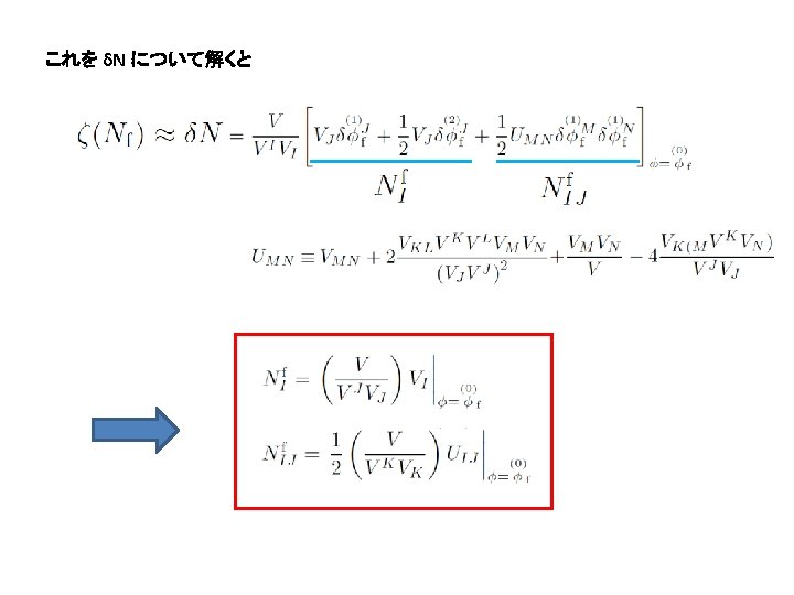 Super horizon scale での曲率揺らぎの発展 Separate universe approach Local expansion から (e. g. , Sasaki&Stewart, 96) = expansion of the unperturbed universe までのe-folding number Friedmann宇宙 曲率揺らぎ の相関関数が分かれば、 の相関関数が分かる Friedmann宇宙