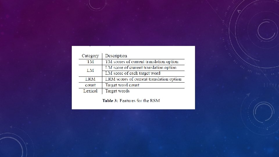 The Revising Suggestion Model (RSM) • For translations of a given source phrase, there is no need to compare their source-side information because these translation options share the same source phrase and context. • Features mainly focus on estimating the translation quality of a given translation option.