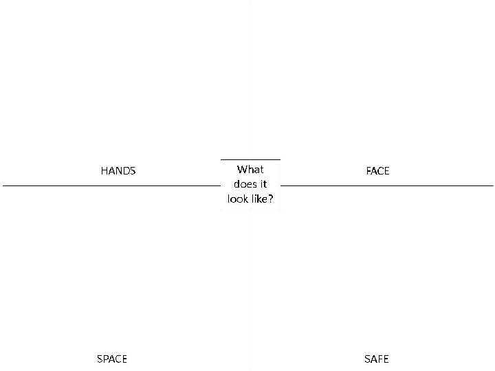 SCHOOL WIDE: HANDS. . FACE. . . SPACE. . . SAFE Common Expectations All students, staff, volunteers will say and sign the school wide mantra HANDS, FACE, SPACE, SAFE HANDS: 1. All students can demonstrate how to wash hands effectively with soapwater & hand sanitizer. (all parts of the hands and how long it should last) 2. All students know when they are expected to wash hands with soapwater & hand sanitizer. FACE: 1. All students know how to cough and sneeze to prevent passage of germs to others (Vampire Cough & Sneeze) 2. When developmentally appropriate, students should know when to wear a mask. 3. When developmentally appropriate, students should know how to wear a mask. 4. When developmentally appropriate , students can explain why we wear a mask and touching eyes, nose, and mouth can spread germs. SPACE: 1. All students know how far is 6 feet. (i. e. , social distancing considering developmentally appropriate) 2. All students will be able to demonstrate safe ways to work with others. SAFE: 1. All students can explain how HANDS, FACE, SPACE can keep everyone SAFE.