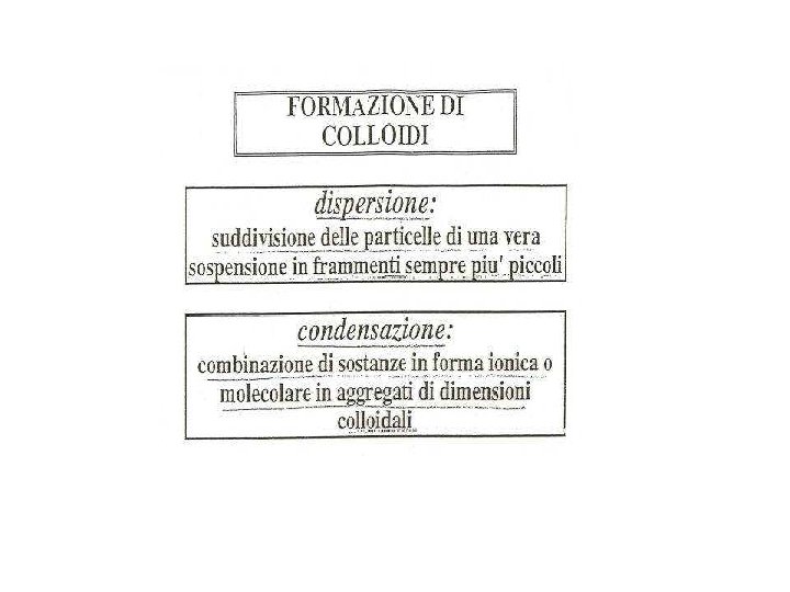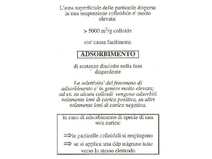 Principali Proprietà dei Colloidi Le principali caratteristiche dei sistemi colloidali possono essere attribuite all'esistenza di un'interfaccia tra fase dispersa e mezzo disperdente. Ogni particella ha infatti una superficie ben definita che presenta le tipiche proprietà interfacciali: l'adsorbimento, lo stato elettrico, la coalescenza, ecc. Pertanto il rapporto superficie/volume delle particelle disperse ha una notevolissima influenza nel determinare il comportamento dei sistemi colloidali. Le principali proprietà dei sistemi colloidali sono: -Coagulazione -Effetto Tyndall -Adsorbimento -Viscosità -Dialisi -Elettroforesi -Moto browniano