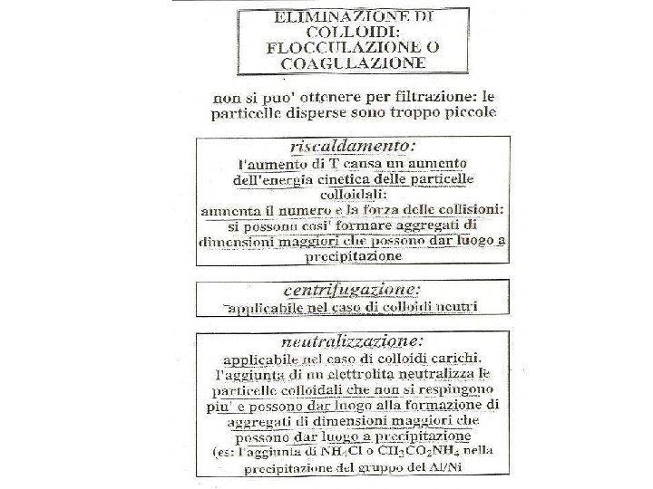 Coagulazione Le particelle della fase dispersa, venendo a contatto tra loro, interagiscono mutuamente per formare aggregati di massa maggiore che precipitano per azione della forza di gravità. Effetto Tyndall Quando le particelle di polvere disperse nell'aria sono investite da un raggio di luce solare che penetra attraverso le fessure di una finestra, diventano visibili ed appaiono come punti brillanti. Questo fenomeno è detto effetto Tyndall e consiste appunto nella diffusione della luce che attraversa una soluzione colloidale.