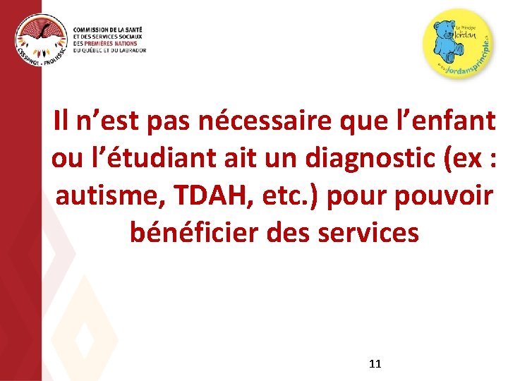 Qui est admissible • Tous les enfants des Premières Nations du Canada âgés de moins de 18 ans, peu importe leur lieu de résidence. • Au Québec, les personnes âgées de moins de 21 ans étant aux études à temps plein au niveau secondaire (ex : cours aux adultes, diplôme d’études professionnelles (DEP)). 10