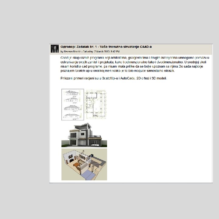 > Zadatak 01 - U okviru ovog zadatka studenti daju kratak osvrt na svoje aktuelno poznavanje primene računara i koriste neki od poznatih programa da predstave prostor u kome trenutno stanuju.
