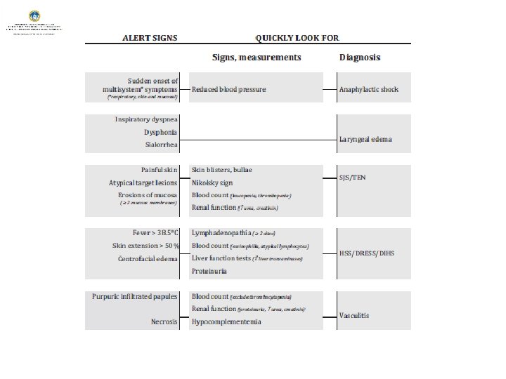 Clinica Reazioni immediate Orticaria Angioedema Anafilassi Rinite Broncospasmo Diarrea Vomito Reazioni non-immediate Rash maculopapulare Orticaria ad insorgenza tardiva SDRIFE AGEP DRESS Eritema multiforme TEN SJS Eritema fisso Reazioni fototossiche Dermatiti da contatto Vasculiti