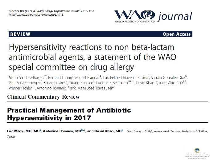 Epidemiologia, clinica, diagnosi e gestione Rare le reazioni da ipersensibilità (0, 4 -3% dei pazienti trattati) Sono stati riportati casi di anafilassi, SOA, rash maculopapulosi, eritema fisso, sindrome di Lyell. La sensibilità dei test cutanei è bassa e non sono disponibili test in vitro Necessario il test di provocazione orale (spesso negativo!) La cross-reattività fra le molecole del gruppo è risibile (descritta in rari case report) Possibile la desensibilizzazione (ad es. spiramicina in gravidanza)
