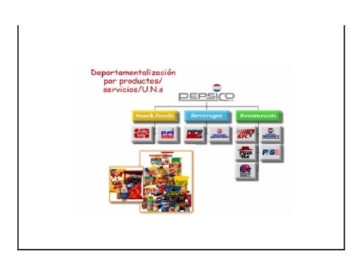 c) Departamentalización por productos Las actividades se agrupan alrededor de un producto o grupo de productos. La racionalidad de este enfoque es que a medida que el número de productos crece, estos se hacen más diferenciables. Gerente General División Cocinas División Refrigeradores División Muebles de Madera