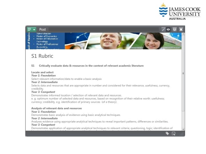 Whole of Program Rubric PLO 1 Demonstrate essential knowledge necessary for a career in business related professions Year 1: Foundation Year 2: Intermediate Year 3: Competent A Appreciation of essential concepts necessary for a career in business and related professions. Describes essential concepts of business. Explains essential concepts of business, demonstrating application of concepts. Interprets essential concepts of business hypothesising, and assessing aspects of the concepts. B Critical analysis and evaluation of essential concepts. Demonstrates some critical analysis/evaluation of essential concepts. e. g. Reference to concepts through definition or description only. Demonstrates sound critical analysis / evaluation of essential concepts. e. g. analysis demonstrated through explanation, discussion, investigation, application, interpretation of concepts. Demonstrates thoughtful critical analysis and evaluation of essential concepts. e. g. involvement of reflection, judgment, problem-solving, synthesis, assessment, prediction. C Consideration of the economic, social and cultural environments within which international businesses operate. Demonstrates some consideration of the economic, social and cultural aspects of international business context. Demonstrates sound consideration of international economic, social and cultural differences between cultures and how these differences impact ways that business operates. Demonstrates high level understanding of international economic, social and cultural environmental issues in an international business situation. e. g. accurate explanation of relevant actions and prediction of responses.