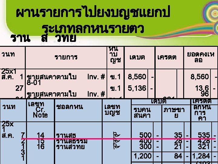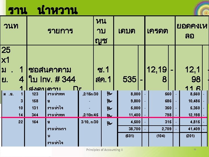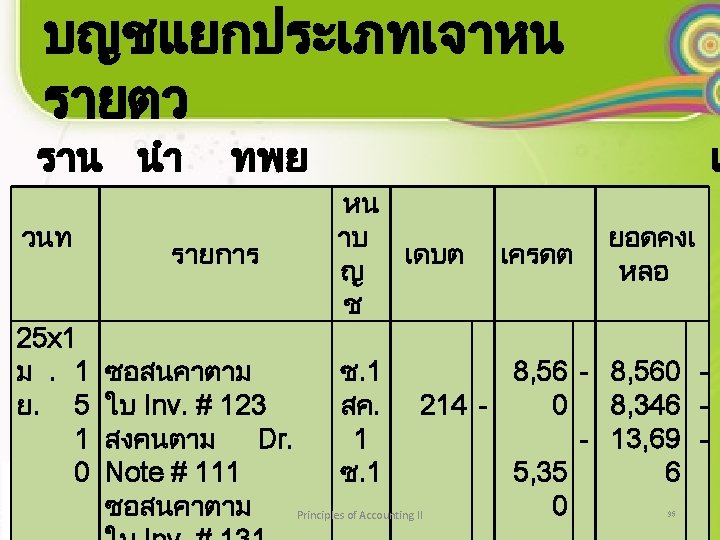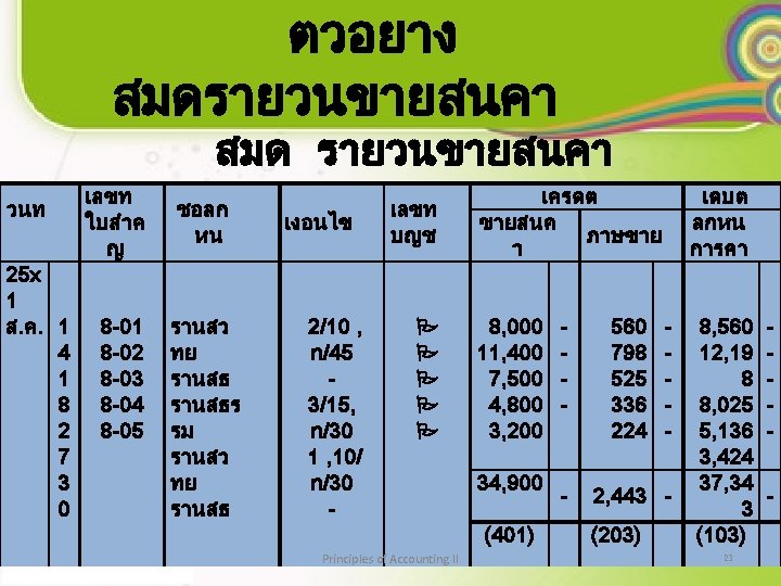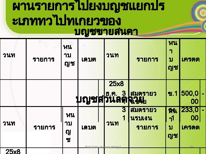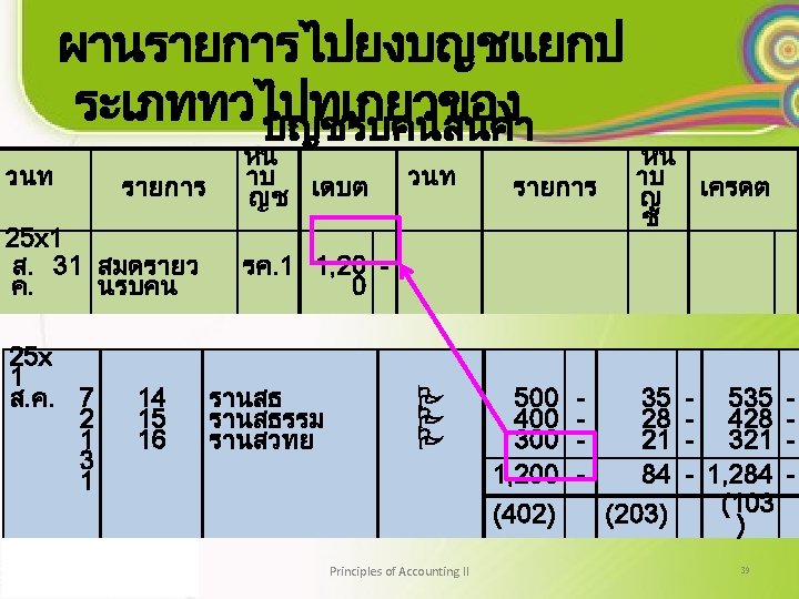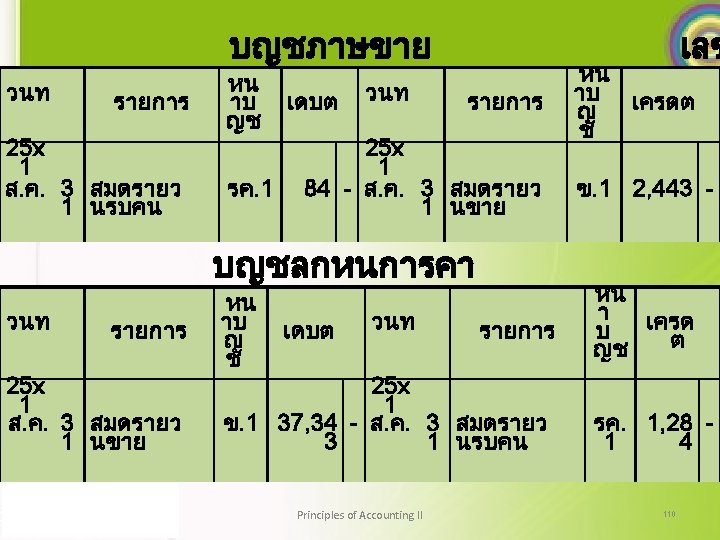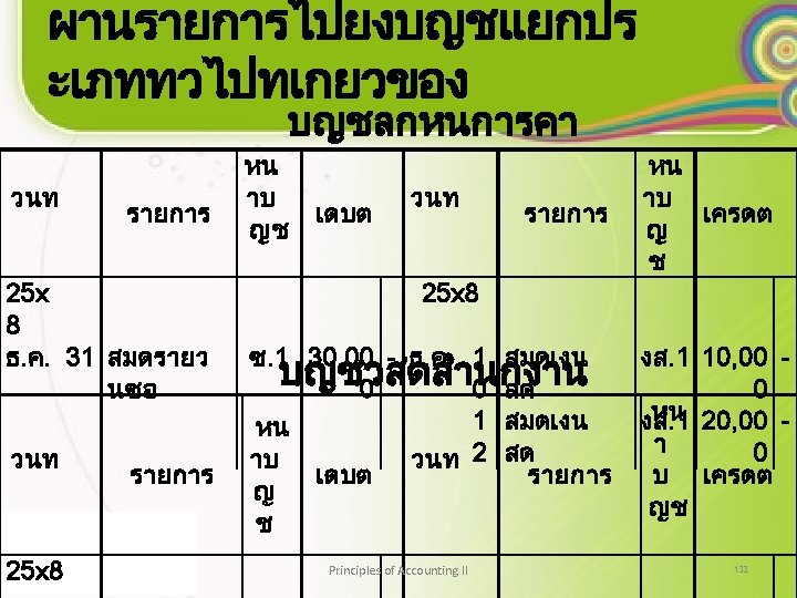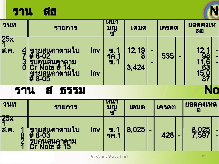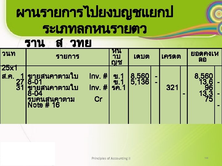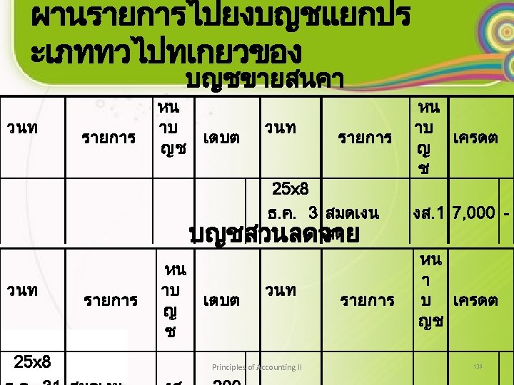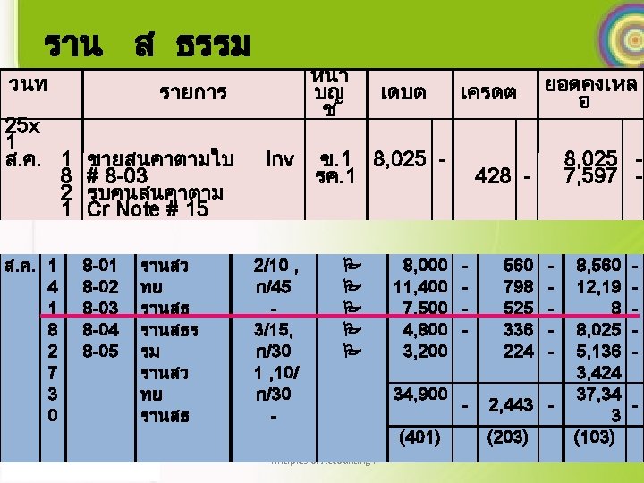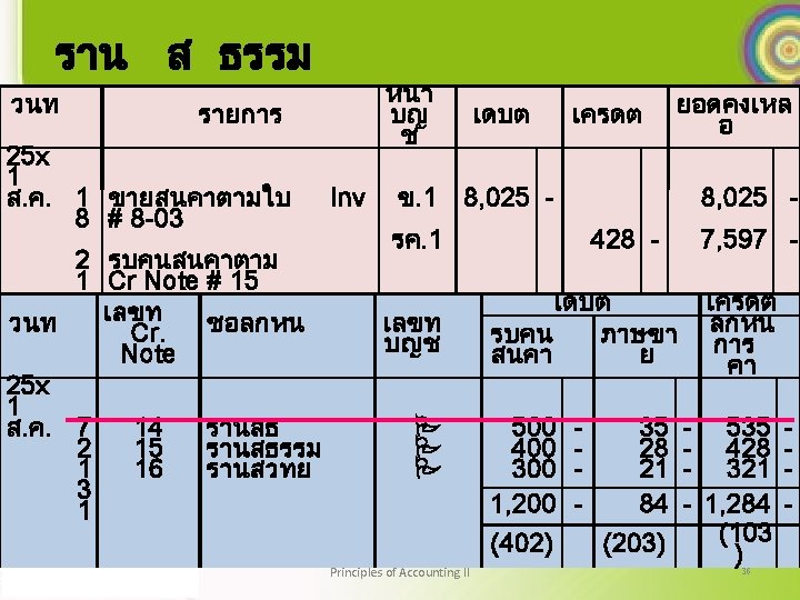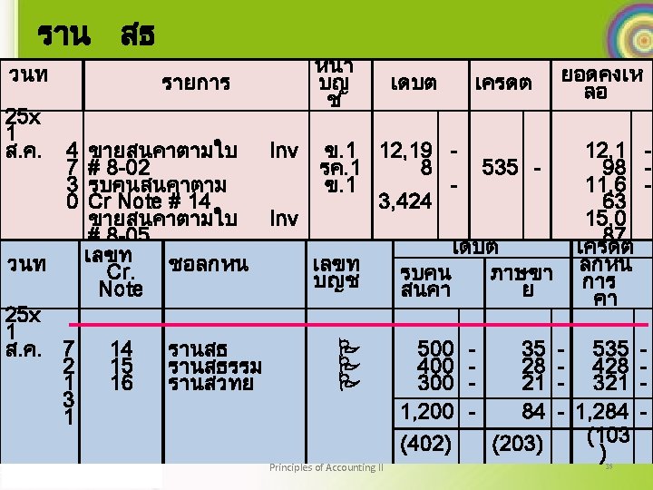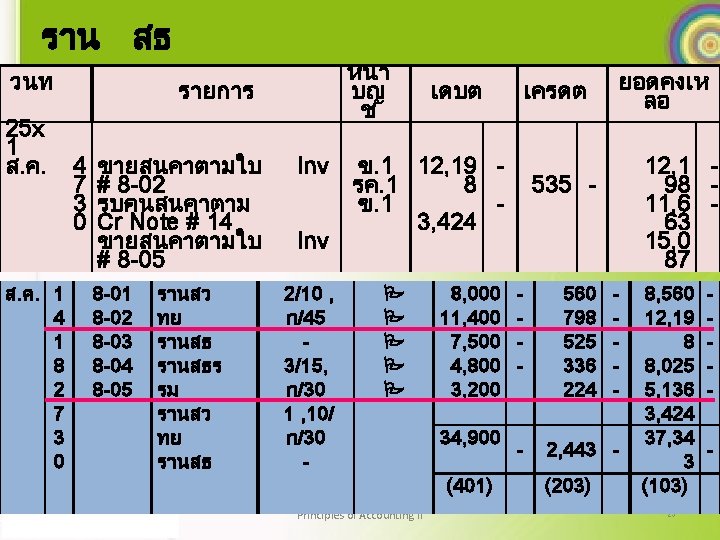 ผานรายการไปบญชแยกปร ะเภททวไป ลกหนการคา Date Description 25 x 1 ส. ค. 31 สมดรายวนข าย ส. ค. 1 4 1 8 2 7 3 0 8 -01 8 -02 8 -03 8 -04 8 -05 รานสว ทย รานสธร รม รานสว ทย รานสธ Page No. Dr. Date Description amount ข. 1 37, 343 - 2/10 , 8, 000 n/45 11, 400 7, 500 3/15, 4, 800 n/30 3, 200 1 , 10/ n/30 34, 900 Principles of Accounting II - Page No. 560 798 525 336 224 - 2, 443 - Cr. amount 8, 560 12, 19 8 8, 025 5, 136 3, 424 37, 34 29 3 -